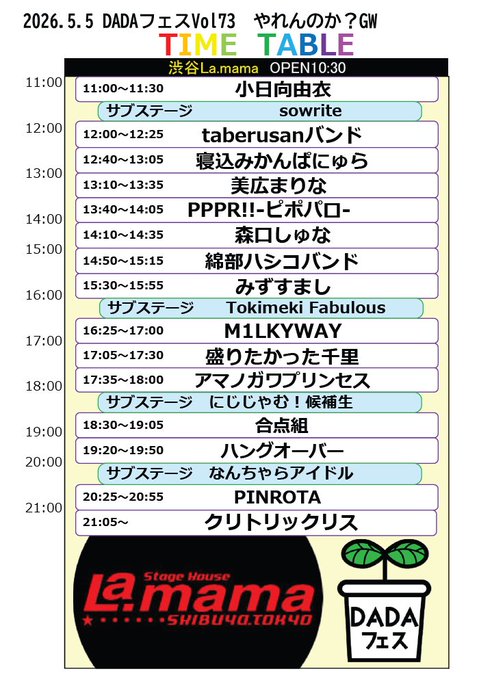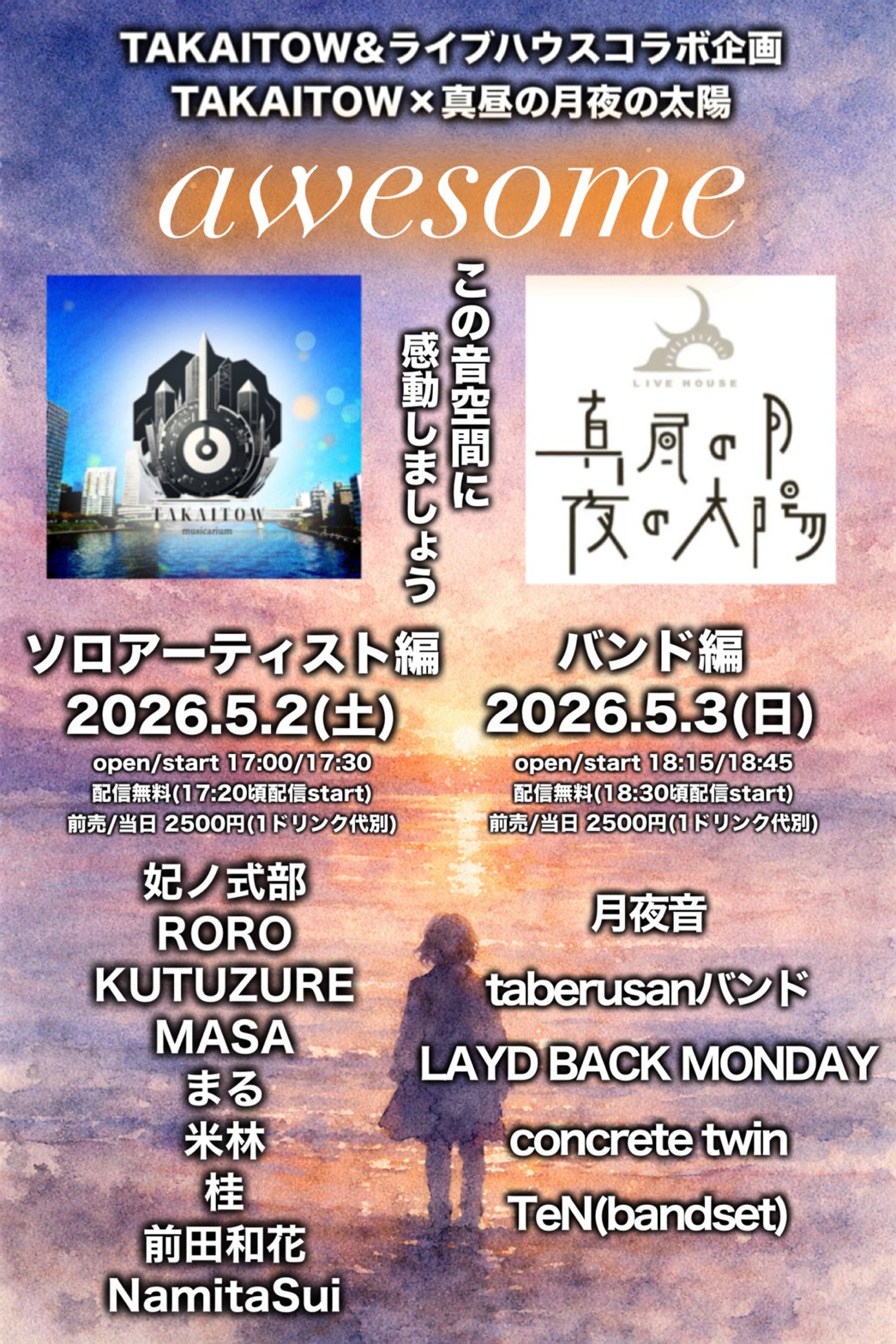 LIVE SCHEDULE 2026.5.3(日)東新宿 真昼の月夜の太陽 TAKAITOW&ライブハウスコラボ企画 「awesome」 ※バンド編成 2026.5.5(火祝)渋谷La.mama 「DADAフェス Vol73 やれんのか?GW」 ※バンド編成 2026.6.18(木)渋谷La.mama 太宰ちゃんpre. 「人間失格 vol.2」 ※バンド編成